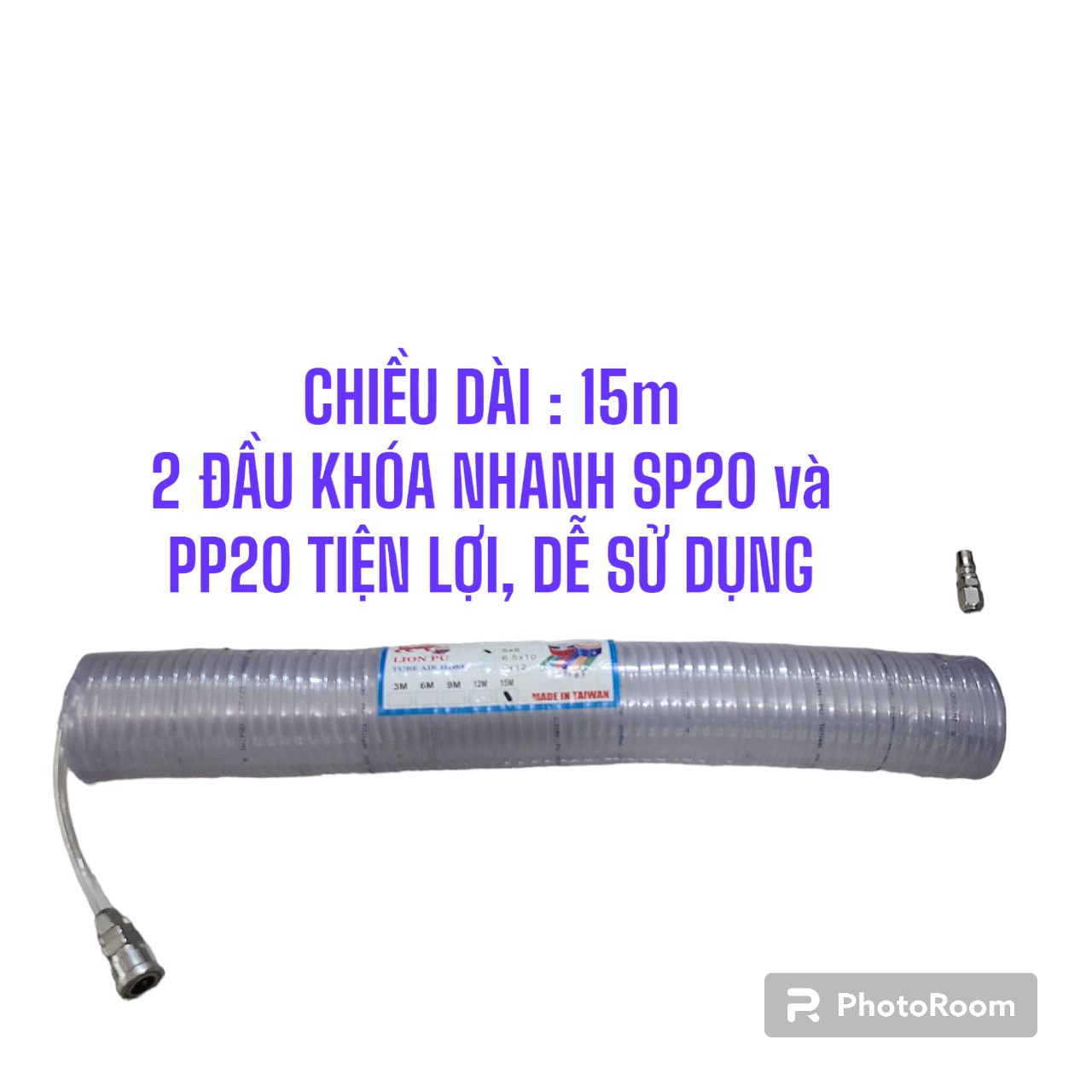 – Dây hơi xoắn phi 8 nhựa PU trắng Lion có sẵn 2 đầu nối bình hơi dài 15m, Với các đặc điểm nổi bật: