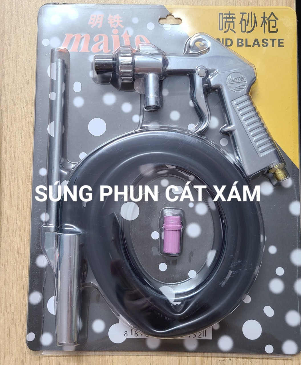 -Súng phun cát là một công cụ được sử dụng để làm sạch và làm mịn bề mặt các vật liệu như kim loại, gỗ, hoặc đá bằng cách sử dụng áp lực của cát.